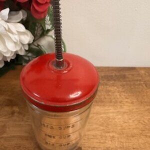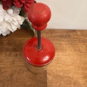 This vintage glass nut chopper combines functionality with classic design. Featuring a 12 oz glass jar with measurement markings, a sturdy metal chopping mechanism, and a comfortable wooden handle, it's perfect for both use and display in a retro-inspired kitchen.