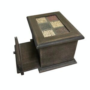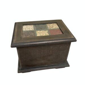 Vintage wood box. Lid is hinged. Glass Pane with various grain as decorations. Faux drawer at the bottom.