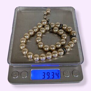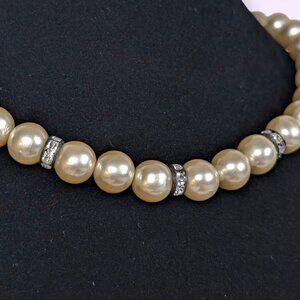 This vintage necklace is beaded and has an adjustable hook clasp closure. The necklace is strung with beige glass (faux) pearls that are uniform in size, shape, and colour. There are 3 metal rhinestone spacers at the front as well. With the adjustable length, the necklace falls easily into the "choker" length, but just exceeds it at its longest. The necklace has a nice weight to it, and the glass pearls have a nice lustre. There is normal wear throughout the piece, including tone darkening in the metal, some loss of shine in the rhinestones and, looking at picture 4, empty space on the string that suggests the loss of 1 bead at some point. Still, the necklace is very wearable.