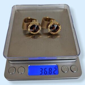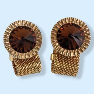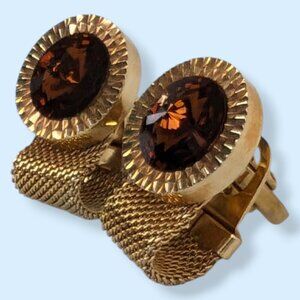 These vintage cufflinks are made of a gold tone metal and are a little more ornate than the standard cufflink. Each of these cufflinks features a brown/orange glass stone with a rivoli cut (think round, flat pyramid) and a gold tone border. There is a small piece of gold tone mesh that starts under the stone and loops back to fit over the back closure. The effect of the little detail is that the little mesh piece is visible on the cuff. These cufflinks have normal vintage wear and there is some minor tone loss on the underside, but nothing that affects wearability.