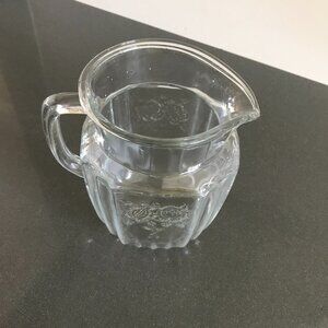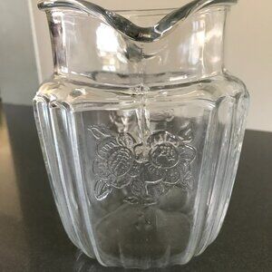 Excellent used condition. Practical and pretty pitcher is about 6" tall and 4" diameter at the top. Flower designs on four side and fluting at the corners.