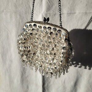 Silver beaded trim and silver chain that can be tucked away inside the purse to use it as a clutch