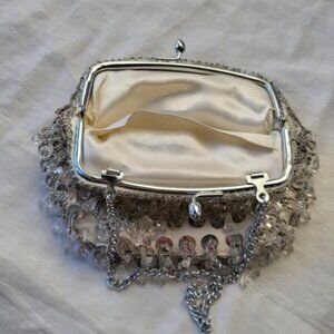 Vintage Glittery Silver Sequins Beaded Satin Evening Purse Clutch