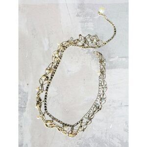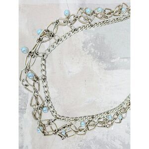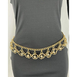 Gold chain belt with a second layer of chains (different material, much lighter) holding faux pearl beads.