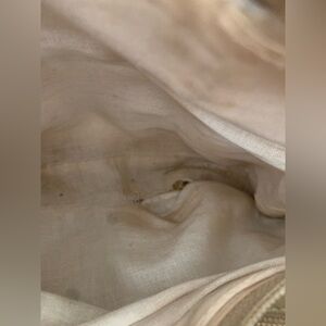 Embrace a touch of retro charm with this unique vintage handbag. Featuring a stunning combination of materials, this purse is a true statement piece. The exterior showcases a patchwork of woven straw and natural cork, accented by a striking metallic gold trim. The bag's interior is lined with a soft, natural-colored fabric.