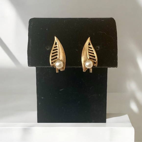 Vintage Gold Filled Genuine Pearl Clip on Leaf Earrings.