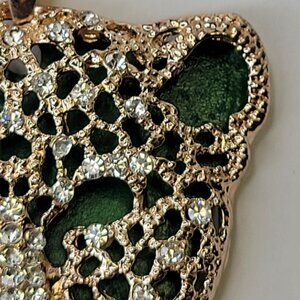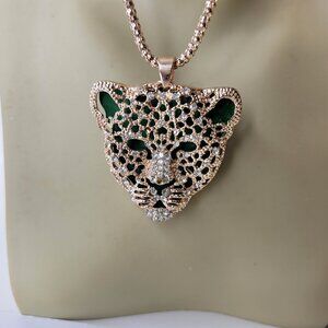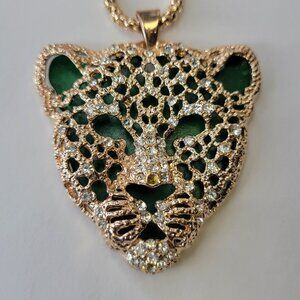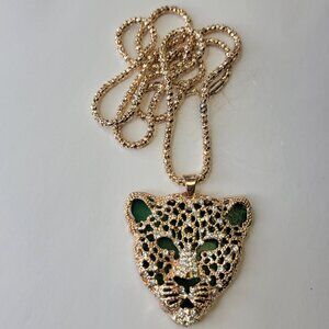 Vintage Gold Rhinestone Panther Tiger Pendant Crystal Cheetah Long Necklace