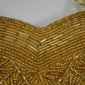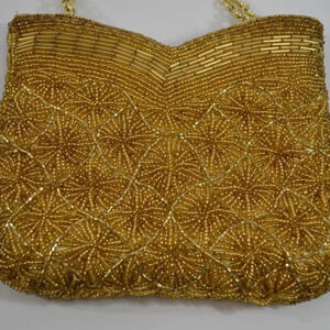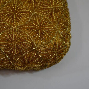 Small vintage evening purse with gold tone beads in an intricate pattern. Lovely condition, extremely clean inside and out. A couple bead strings appears to be hanging slightly loose as shown in pictures, but this might be intentional. No brand tag, inner tag just says Made in Macau. Bag is about 6 x 6.5".