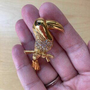 Bring a tropical touch to your outfit with this charming vintage toucan brooch. Crafted in a gold-tone finish, the bird perches gracefully on a branch, sparkling with clear rhinestones and a striking green eye accent. A fun and unique piece that adds personality and shine. Perfect for collectors or anyone who loves bold, nature-inspired accessories.