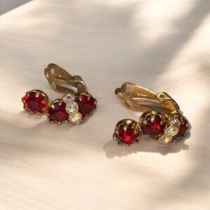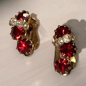 Vintage Gold Tone Clip on Earrings with Round Red and Clear Stones with Prongs