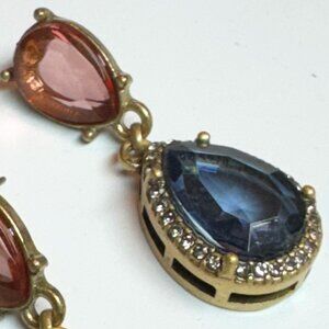 Vintage Gold Tone Dangling Pierced Earrings Teardrop Glass Stones in Pink & Blue surrounded by small clear stones.