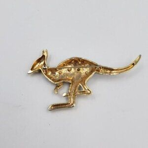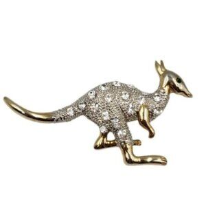 Add some whimsy to any outfit with this kangaroo brooch. Gold tone with clear diamonelle rhinestones