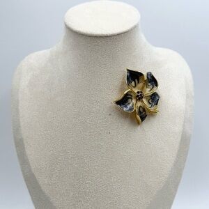 Vintage Gold Tone Enamel with Rhinestone Center Flower Brooch