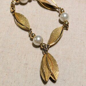 This elegant vintage bracelet features a beautiful combination of textured gold-tone leaves and luminous faux pearls. The leaf motif, paired with delicate gold bead accents, creates a timeless and nature-inspired design.