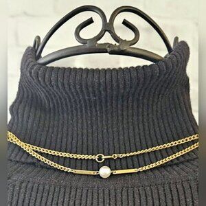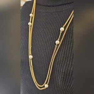 Timeless and elegant vintage gold-tone long necklace featuring faux pearls spaced along a sleek double chain. This piece can be worn single and dramatic or wrapped for a layered, double-strand look — perfect for elevating sweaters, dresses, or office outfits.