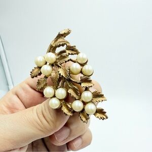 This vintage brooch features a gold-tone leaf and grape design, accented with lustrous faux pearls for a classic and elegant look. A perfect accessory to add vintage charm to any outfit.