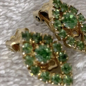 Vintage Gold Tone W Green Gems Clip On Earrings Costume Jewelry
