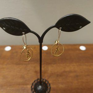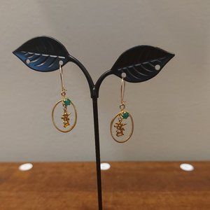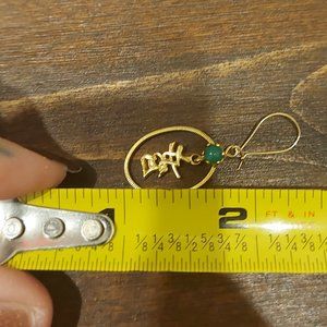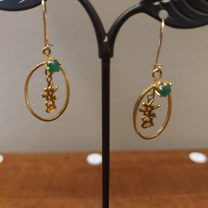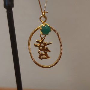 Earrings feature a Gold toned hoop with hammered details and a Chinese charter inside. Small faux jade stone accent for added beauty. Earring are for pierced ears and feature a deep loop with directional closure.