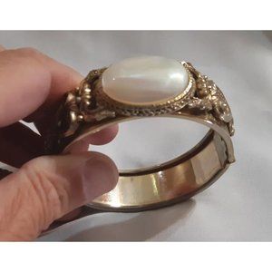 A gorgeous vintage hinged bangle bracelet circa 1950s-60s or earlier. The interior diameter dimensions of the bracelets are about 2 1/4 inches by about 3/4 inches. Goldtone metal, with gorgeous floral and leaf design. Oval white mother of pearl cabachon. The mother of pearl cabachon is about 3/4 of an inch in diameter. Hinged with a pinch clasp. Please review the photos for an accurate depiction of this vintage bracelet.