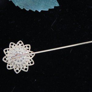 A quaint set of 2 vintage stick pin brooches. These little pins make for cute label pins or add a subtle vintage touch to your look. The pins each feature red roses done in petite point embroider against a white backgorund. The brooches are each framed in an filigree style frame. There are 2 brooches included. One is in an oval shaped frame and the other a starburst style frame.