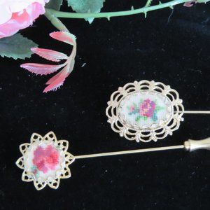 Vintage Gold Toned Petite Point Stick Pin Brooch, Embroidered Roses, Set of 2