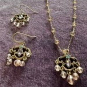 Vintage Gold-Finish Chandelier Pendant and Earrings Set