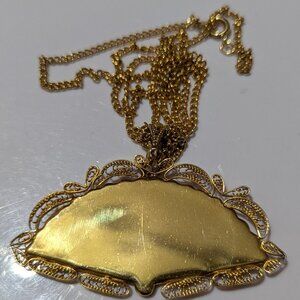 Elegant vintage-style gold-tone necklace with a black-and-gold Damascene-inspired pendant in a decorative filigree frame. Fan-shaped pendant measures approx. 6 cm (2.3 in) wide, on a 20 in chain. No maker’s mark visible. Likely mid- to late-20th-century fashion jewelry.