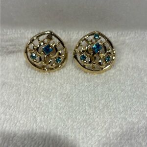 Vintage Gold-Tone Filigree Screw Back Earrings with Blue Rhinestones