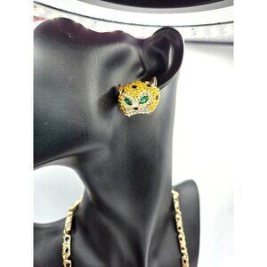 Vintage Golden Leopard necklace and pierced earrings set Emerald Green eyes 20"