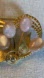 Vintage gold-toned brooch featuring a central design of three cabochon-cut, pinkish-beige mother-of-pearl gems arranged on stems. They are surrounded by intertwining gold-toned metalwork, including smooth curved lines and textured, twisted elements. A delicate, textured leaf-like accent is also present within the design, and the overall shape is an elongated oval with a pin mechanism on the back.
