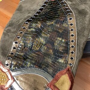 They are adorned with different colours of leather with green suede and snake skin. The gold trim on the boot has a shine to it as do the gold rivets.