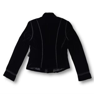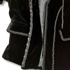 Vintage Victorian / Edwardian Style Black Velvet Blazer Jacket. Beautiful Mandarin Neck, Basque Waist Line, Finished off with 3 Types of Gimp Braided Trim. Fully Lined, the Outer is a Silk Polyester blend, Making this an Extremely Soft Velvet. The Jacket is Darted for a fitted look. 14 Hook and Loop Closures In the Center Front of the Jacket For Seamlessness. The Shoulders are padded for form.