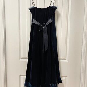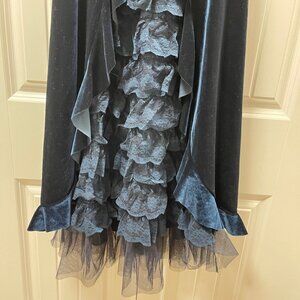 Stunning vintage midnight navy velvet dress with a dramatic ruffled lace panel and layered tulle hem. Features delicate lace trim on the bust, a romantic ribbon tie at the back, and spaghetti straps for an ethereal silhouette. Fully lined for comfort and structure.