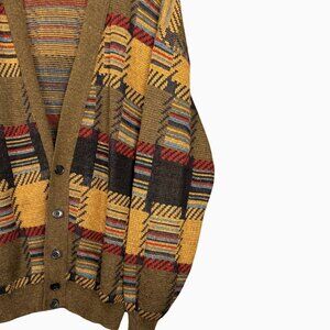 grandpa style cardigan, vintage knit sweater, retro button cardigan, earth tone sweater, oversized acrylic sweater, bold pattern knit, 90s aesthetic cardigan, vintage fall sweater, eclectic retro sweater, unisex vintage