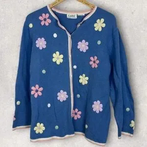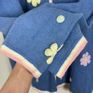 Vintage Granny Core Sweater Embroidered Floral Cardigan Knit Blue Pastel Size XL