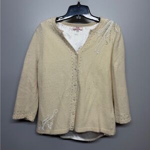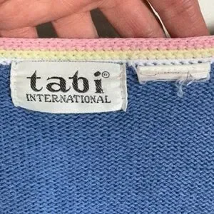 Vintage Tabi Pastel Blue Floral Embroidery Knit Cardigan Sweater. Crew neckline. Long sleeves. Button down. Very good pre-owned condition. No visible flaws but note that size tag missing. See measurements below. Fits like women's size XL or XXL.