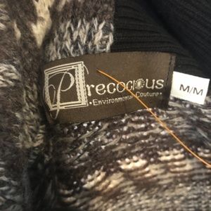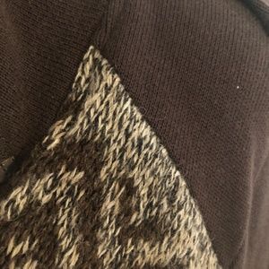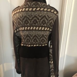 This coat sweater is an interestesting design with short zipper at neck and large metal buttons. Its a one of a kind composed of two sweaters. Made with a great compilation of sweater and knits. Precocious environmental designs beauty. Size medium. PTP 18” but stretch to 20”. Length 26” so many ways to wear this one. Great with jeans and tall boots