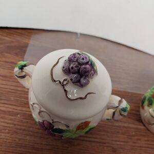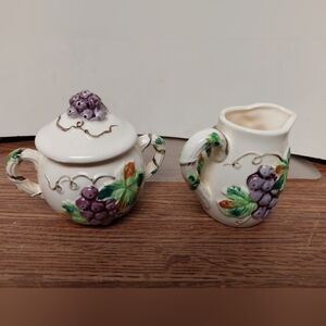 Vintage* Sugar and Creamer Set. Embossed grape relief. Excellent pre-owned condition. Made in Japan. Approx 3.5" tall. Crackling taking place in glaze. 60s.