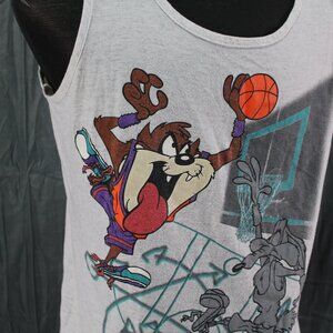 Up for sale is a vintage graphic tank top. It has a grey base colour The front graphic on the tank is very large and features Taz Dunking a basketball on Wile E Coyote. The back of the tank has play to the max or not at all screened on. What a great vintage tank do not miss out on it.