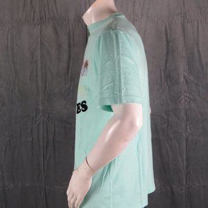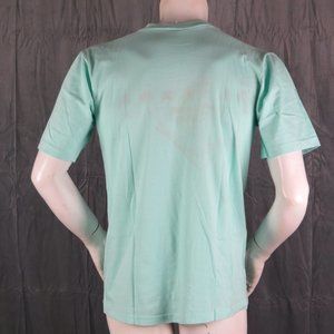 Up for sale is a vintage graphic t-shirt. It has a mint green base colour. The graphic on the shirt is dyed in which features a car driving toward a sunset beach. The word Fab Fifties in crested on in felt lettering. What an amazing vintage t-shirt do not miss out on it.