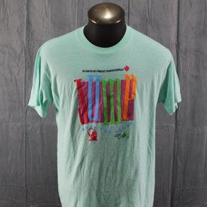 Up for sale is a vintage graphic t-shirt. The shirt has a green base colour. The shirt is a promotion jump rope shirt for heart. It has a Jump in puffer letters across the front of the shirt. What a great vintage shirt do not miss out on it.