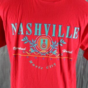 Up for sale is a vintage graphic t-shirt. It has a red base colour and is for the Opryland Hotel. The graphic has Nashville across the top and Opryland Hotel between a guitar crest graphic. All graphics on the shirt are puffy. What a great vintage shirt do not miss out on it.
