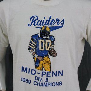 Up for sale is a vintage graphic t-shirt. It has a white base color. It has a graphic screened on in blue and yellow. The graphic features a football player with the wording Raiders Mid-Penn Div II champions 1989. What a great vintage shirt do not miss out on it.