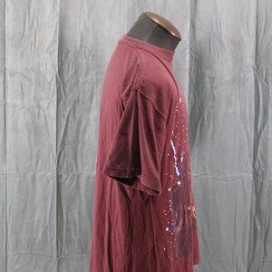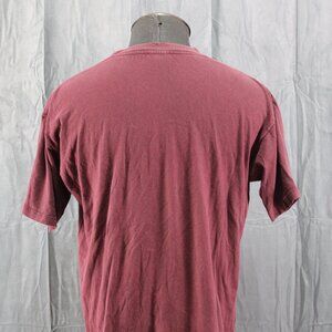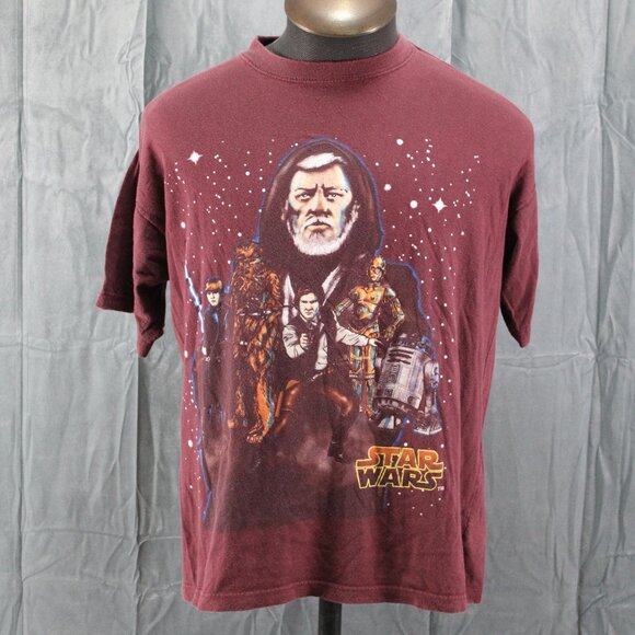 Up for sale is a vintage graphic t-shirt. It has a maroon base colour with a graphic of the original Star Wars heroes screened on the front. What an amazing vintage shirt do not miss out on it.