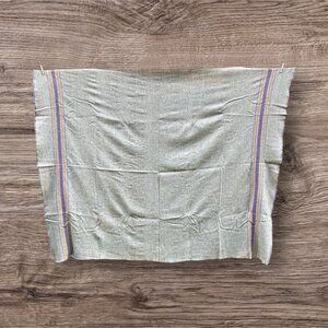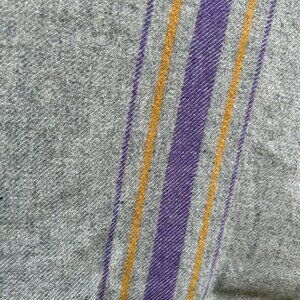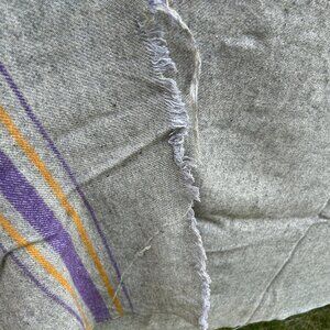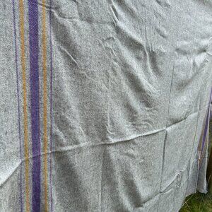 Cozy and rugged vintage wool blanket in gray with purple and yellow stripes on each side. Made of 100% wool, this blanket has that authentic itchy wool texture and shows some fraying on edges (as shown in photos), adding to its rustic charm.