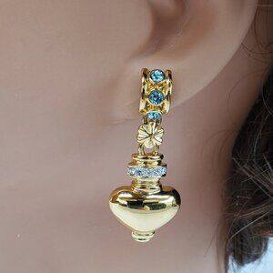 These beautiful gold-tone dangling earrings have a Grecian feel to them. They feature aquamarine and clear rhinestones, making them perfect accents.