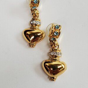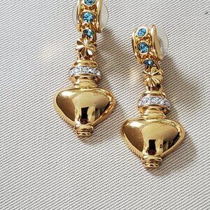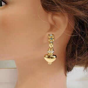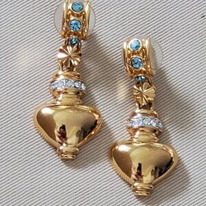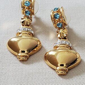 Vintage Grecian Drop Earrings - Gold tone with Aquamarine and Clear Rhinestones