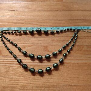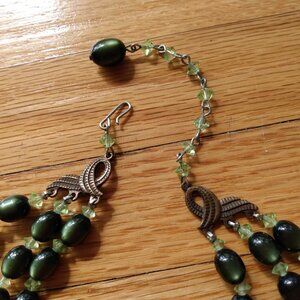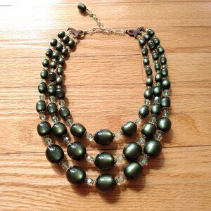 Vintage Green Beaded Necklace Triple Strand Aurora Borealis Glass Collar Choker