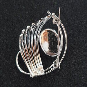 This vintage silver-tone brooch features a luminous natural green chalcedony (also known as green onyx) cabochon at its center. The stone is beautifully framed by an elegant, flowing open-work design, with layered curved lines that create a sense of movement and organic balance. The overall form feels modern yet timeless, making it a striking accent on a jacket lapel, scarf, dress, or handbag.