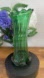 This gorgeous vintage green glass vase features a tall paneled design with a scalloped ruffled rim and an octagonal starburst base. The glass glows with deep emerald tones, making it a timeless statement piece for any home décor style—from Art Deco to retro revival.